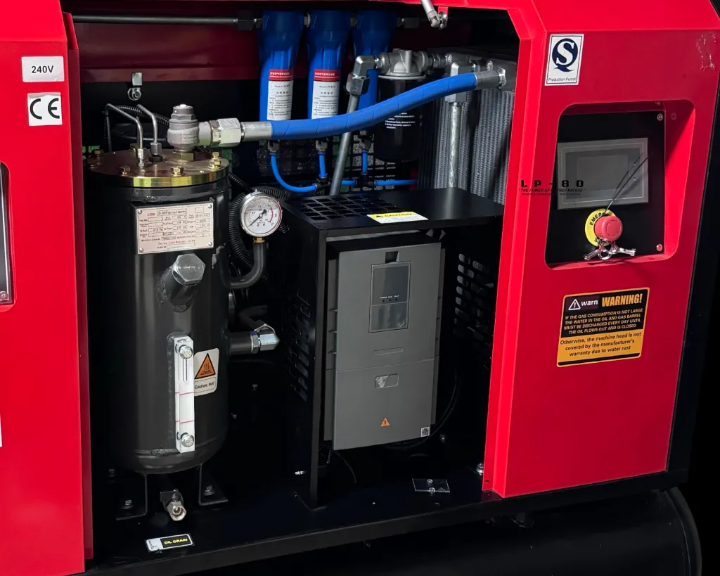 The AeroX LP80 is a 20HP, 100% continuous-duty rotary screw air compressor engineered for operators who need significantly more airflow and reserve capacity than entry-level systems — while still benefiting from a fully integrated, space-saving design.