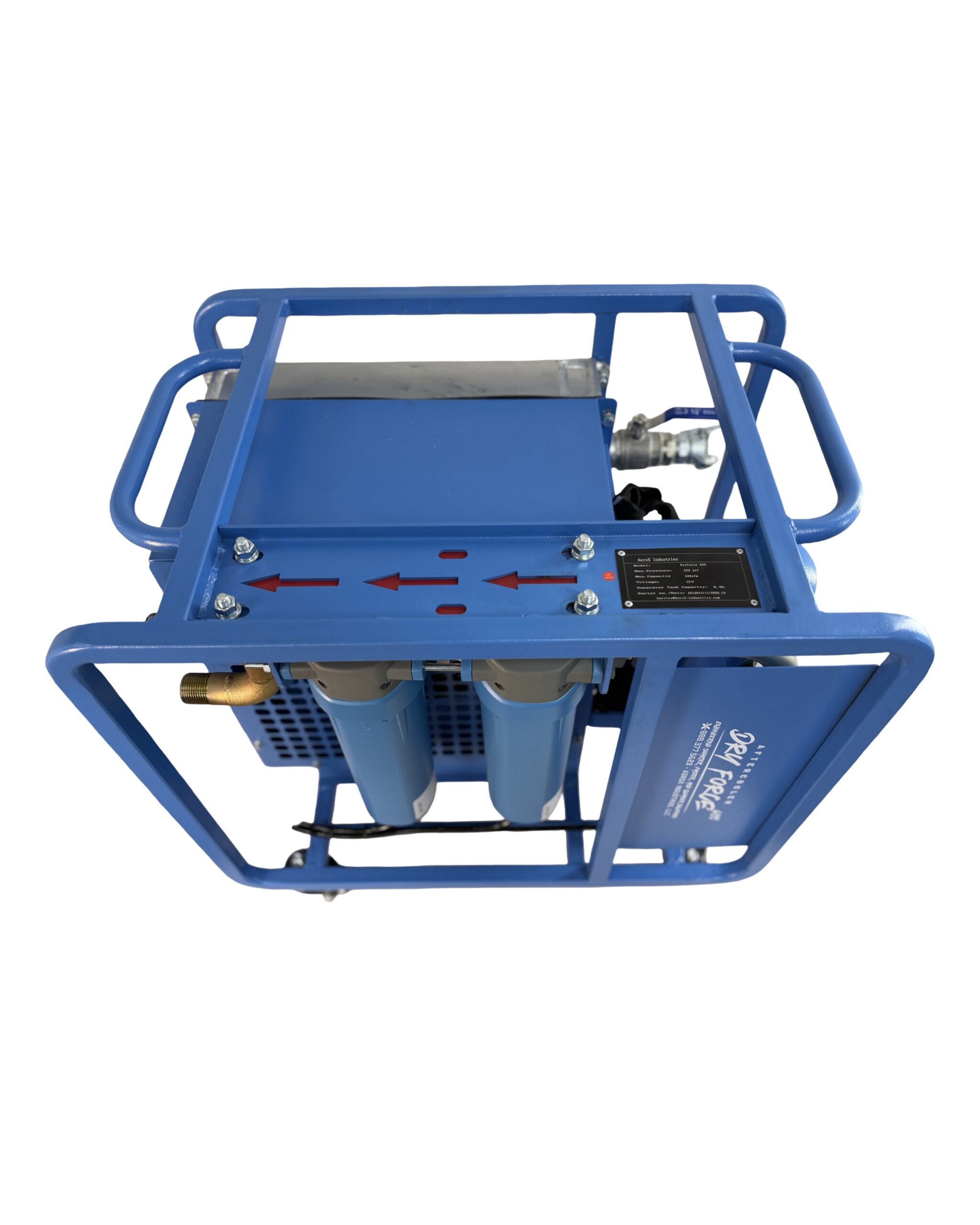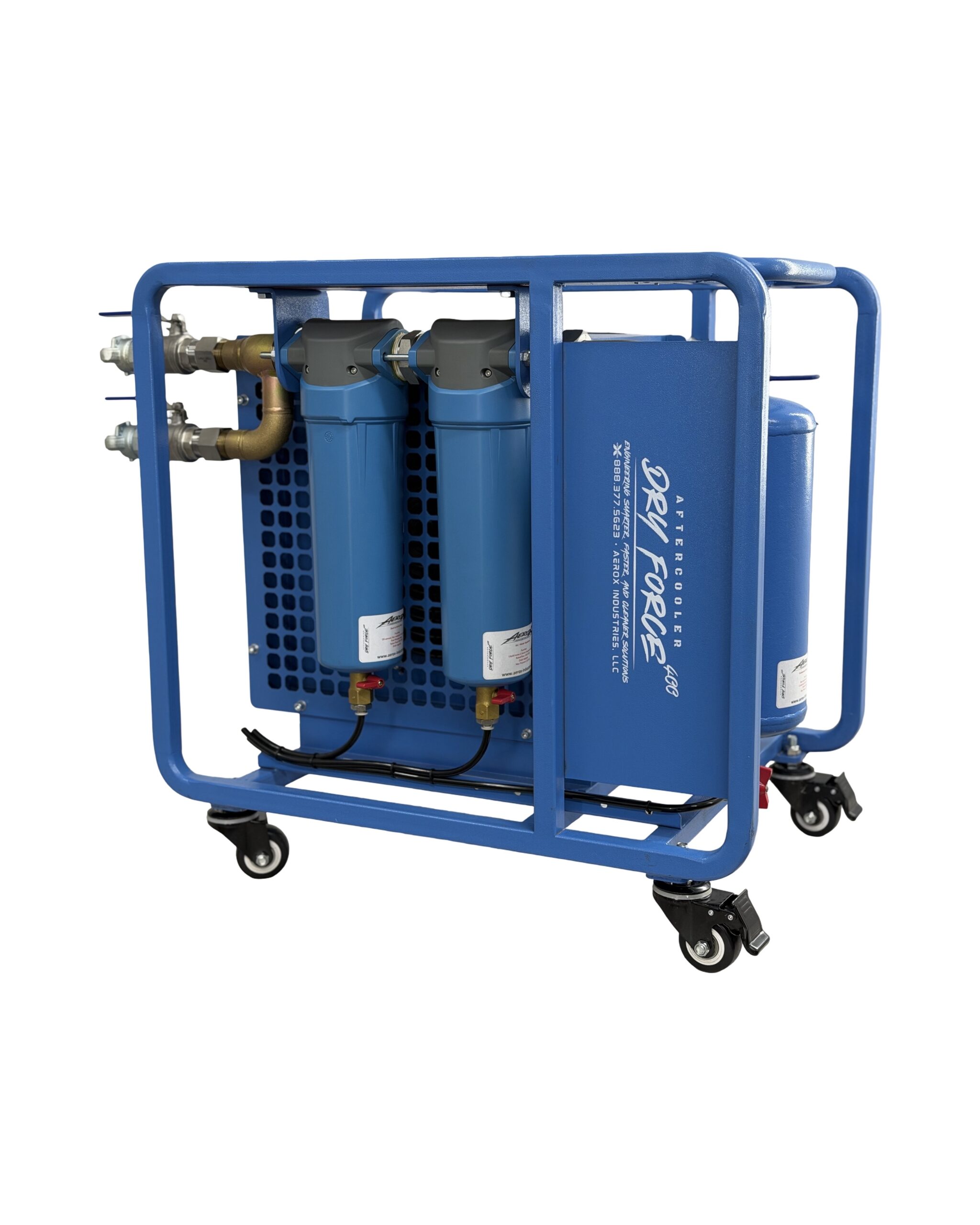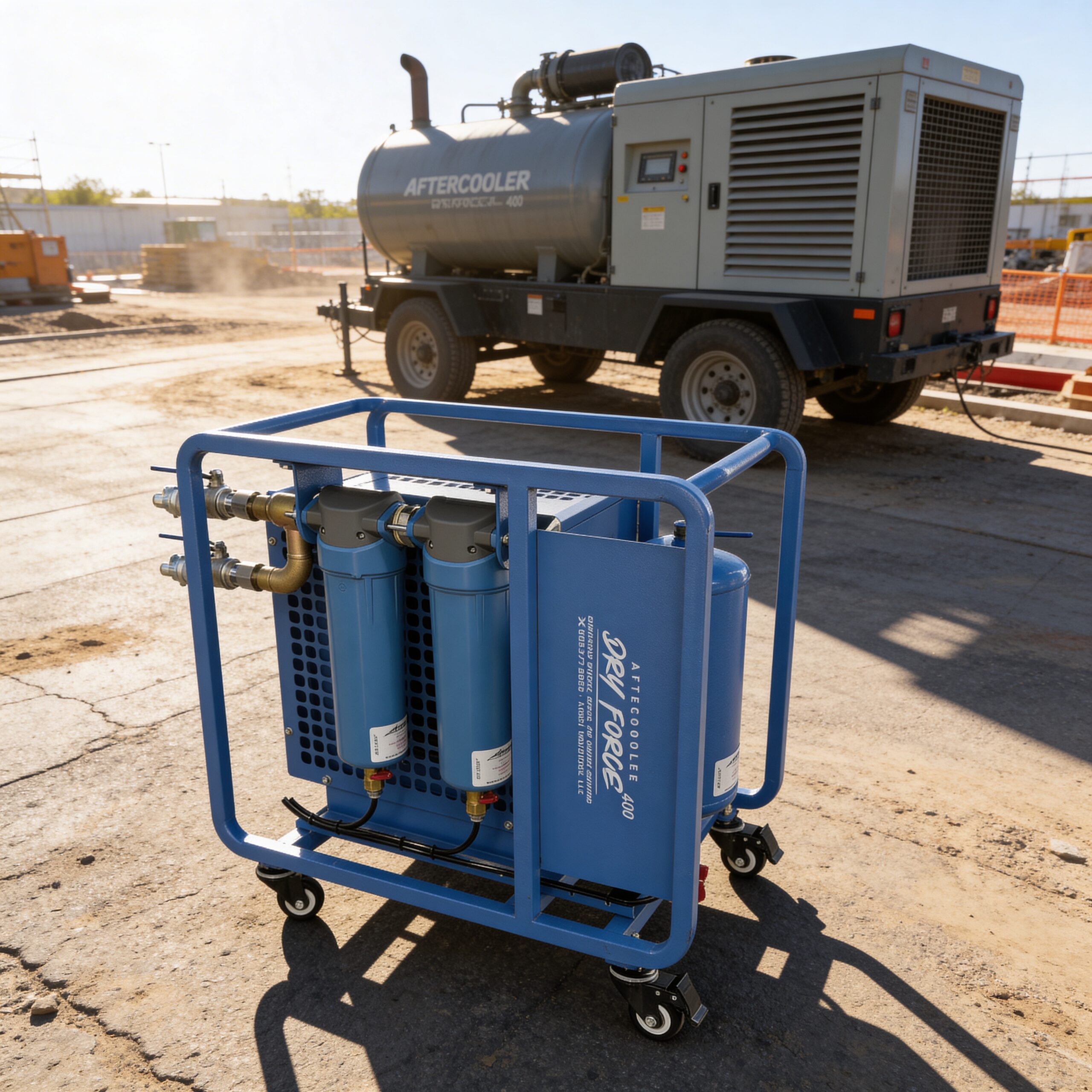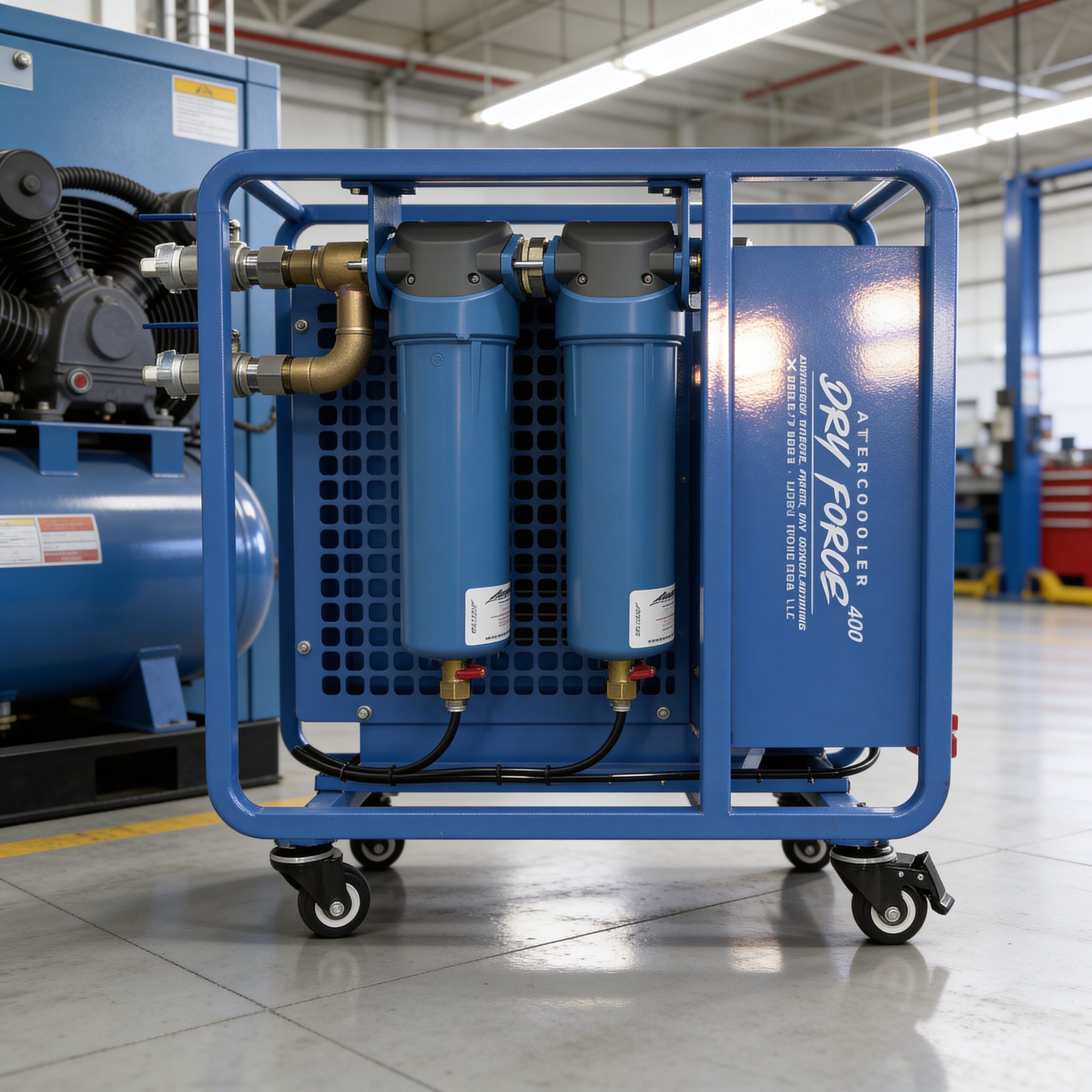 The AeroX DryForce 400 is a high-capacity, 12V-powered aftercooler and multi-stage filtration system engineered to rapidly cool compressed air and remove up to 70% of bulk liquid moisture before it reaches dryers, blasting systems, or pneumatic equipment.